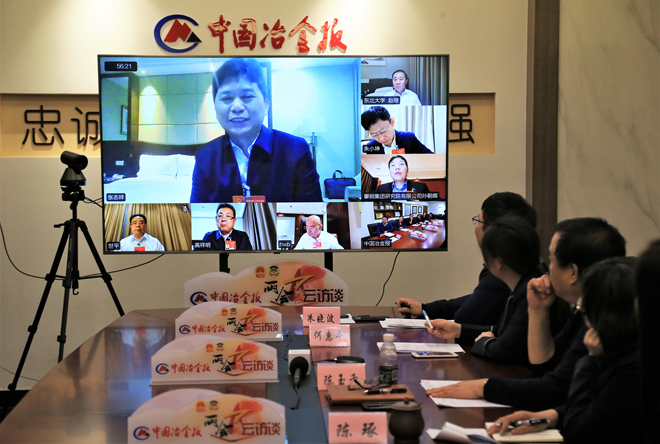 三月九日,在中國冶金報社第二場二〇二一年兩會雲端會客廳上,全國人大代表,建龍集團董事長、總裁張誌祥通過視頻連線接受《中國冶金報》記者的采訪。 (本報兩會報道組記者 顧學超 攝)