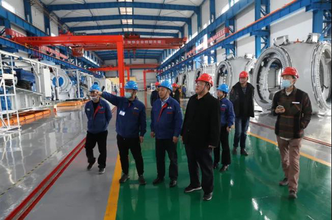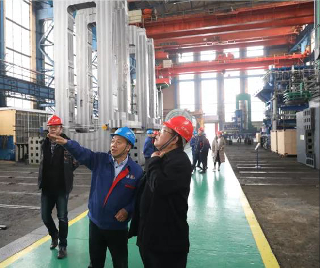 前采期間,蔣金水陪同《鋼鐵脊梁》攝製項目組一行參觀了重型裝備製造廠、萬噸水壓機生產現場、一重風電製造廠和中國一重展覽館。