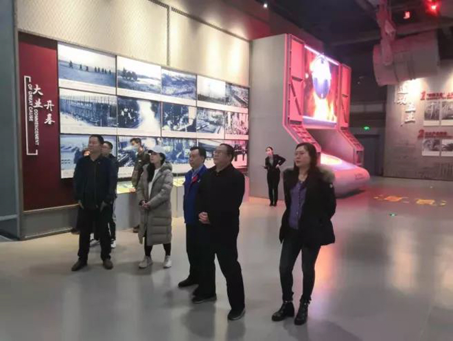 圖為攝製項目組一行參觀中國一重展覽館