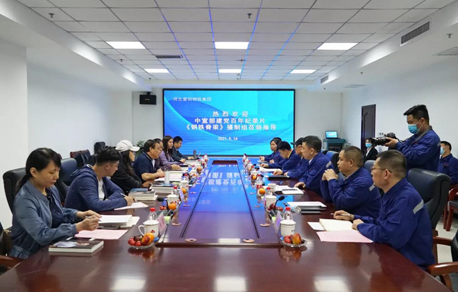5月16日,中宣部建黨百年重磅紀錄片《鋼鐵脊梁》攝製項目組一行到河北普陽鋼鐵有限公司(以下簡稱“普陽鋼鐵”)進行前采。