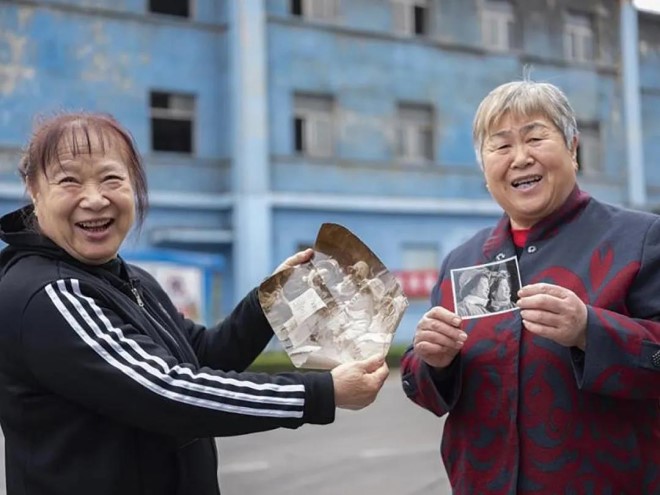 右圖為2020年魏光紅(左)和工友段元琴在特鋼事業部建廠55周年再次回到老廠房時的合影。(朱甲鵬 攝)