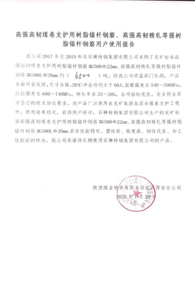 “我公司隨後第一時間將個性化定製的高強錨杆鋼(SKW5)送到現場,解決了客戶的燃眉之急,確保了巷道支護安全,客戶對此交口稱讚。由此成為石橫特鋼忠誠的直供礦務局客戶。”趙峰介紹。