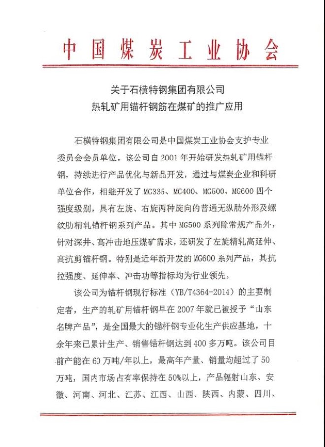這些僅僅是中國500強企業——石橫特鋼生產的“石特牌”錨杆鋼所創造的驕人業績的幾個縮影。