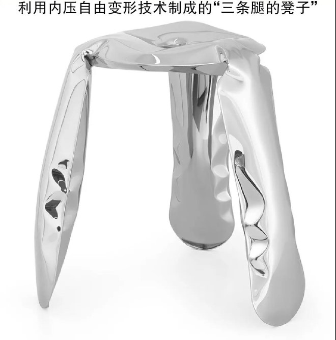 據悉,內壓自由變形技術已經被成功應用在了家具製造領域,該團隊設計的“3條腿的凳子”(如圖)就是采用的該技術。通過向一個閥門充氣,擠壓在一起的鋼板就可以變成一把結實、輕便、時(shi)尚(shang)的(de)座(zuo)椅(yi)。與(yu)機(ji)械(xie)行(xing)業(ye)使(shi)用(yong)的(de)衝(chong)壓(ya)成(cheng)型(xing)方(fang)法(fa)不(bu)同(tong),依(yi)靠(kao)這(zhe)項(xiang)技(ji)術(shu),鋼(gang)材(cai)在(zai)充(chong)氣(qi)期(qi)間(jian)不(bu)依(yi)賴(lai)模(mo)具(ju)成(cheng)型(xing),使(shi)用(yong)者(zhe)甚(shen)至(zhi)可(ke)以(yi)在(zai)家(jia)用(yong)自(zi)行(xing)車(che)打(da)氣(qi)筒(tong)給(gei)家(jia)具(ju)充(chong)氣(qi)。同(tong)時(shi),依(yi)靠(kao)鋼(gang)材(cai)的(de)內(nei)在(zai)強(qiang)度(du)和(he)創(chuang)新(xin)的(de)內(nei)壓(ya)自(zi)由(you)變(bian)形(xing)技(ji)術(shu),該(gai)凳(deng)子(zi)可(ke)以(yi)承(cheng)受(shou)大(da)約(yue)2噸的重量。