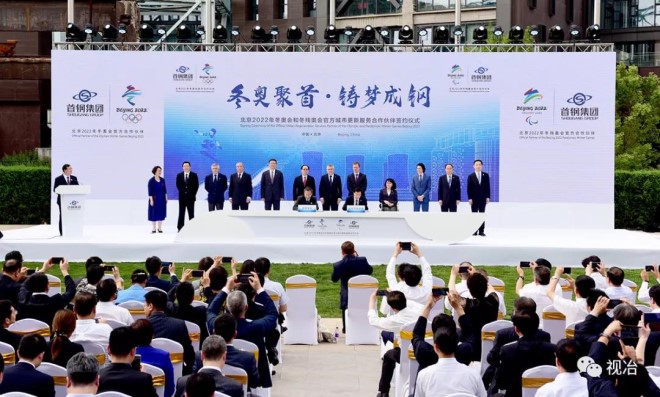 2018年6月5日,北京2022年冬奧會和冬殘奧會官方城市更新服務合作夥伴簽約儀式在首鋼園區北京冬奧組委辦公區舉行。首鋼集團正式成為北京2022年冬奧會和冬殘奧會官方合作夥伴。(孫力 攝)