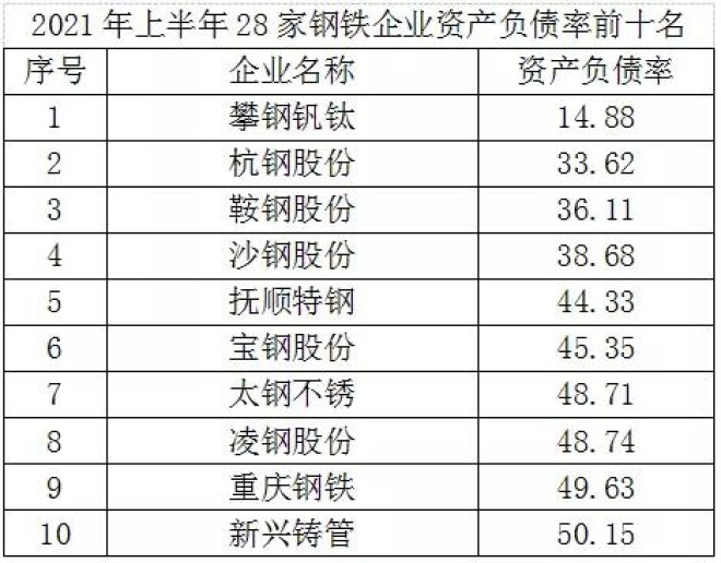 (二)償債能力普遍增強。從資產負債率看,2021年上半年28家鋼鐵企業平均資產負債率57%,與去年同期持平。據公開資料顯示,2021年上半年我國重點大中型鋼鐵企業的資產負債率為62.09%,28家鋼鐵企業的平均負債情況好於全國重點大中型鋼鐵企業平均水平,其中有20家鋼鐵企業資產負債率低於62.09%,有5家鋼鐵企業的資產負債率超過70%。