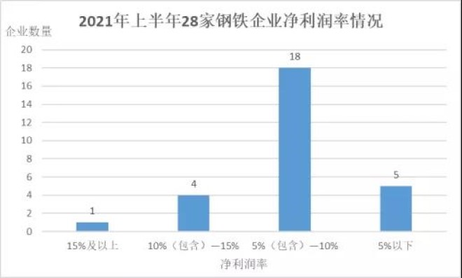 (三)盈利能力顯著增長。從利潤率看,2021年上半年28家鋼鐵企業平均毛利率、淨利率、成本費用利潤率大幅增長,分別為13.60%、7.08%和9.38%,較2020年上半年分別增長3.37、3.94和5.31個百分點。2021年上半年28家鋼鐵企業全部實現盈利,其中安陽鋼鐵和酒鋼宏興去年同期分別虧損3.44億元和0.83億元,實現了扭虧為盈。