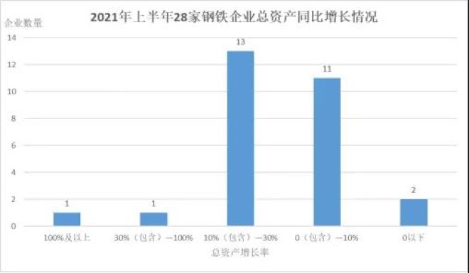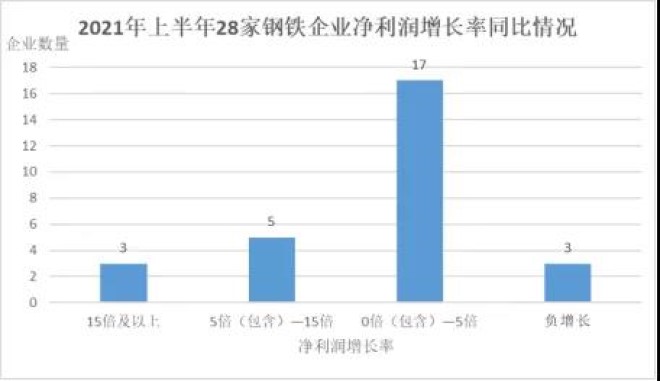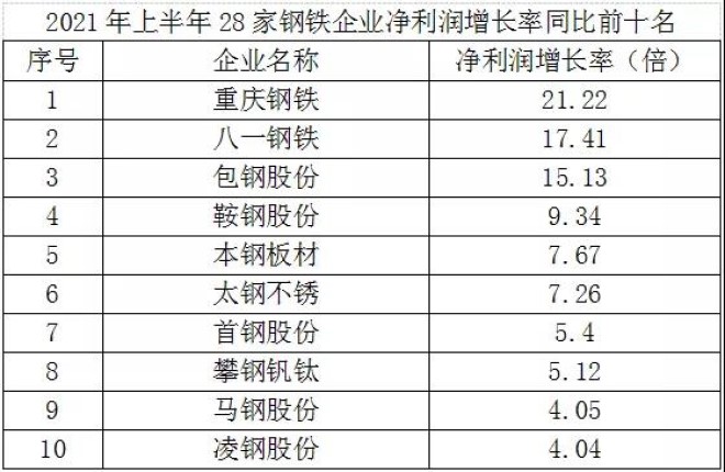 (四)發展能力大幅提高。從營業收入和淨利潤增長率看,2021年上半年28家鋼鐵企業的平均營業收入較2020年上半年增長54.39%,各家鋼鐵企業均實現了正增長,其中增長最快的是重慶鋼鐵,增長率為1.07倍;平均淨利潤較2020年上半年增長2.48倍,其中27家鋼鐵企業淨利潤實現了正增長,下降的僅有一家鋼鐵企業。