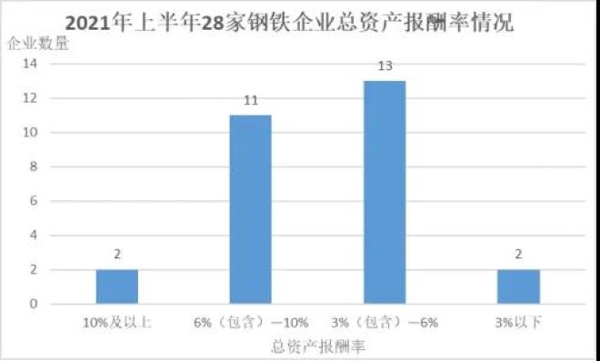 從資產報酬率看,2021年上半年28家鋼鐵企業平均總資產報酬率為5.37%、淨資產報酬率為9.34%,較2020年上半年分別增加2.62和5.59個百分點,反映出鋼鐵企業資產利用效率提高,盈利能力增強。在28家鋼鐵企業中,平均總資產報酬率、淨資產報酬率較2020年上半年都增加的有27家,都下降的有1家。