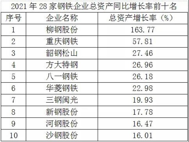 從總資產增長率和資本保值增值率看,2021年上半年28家鋼鐵企業平均總資產增長率為13.03%,其中有26家鋼鐵企業實現了正增長,增長最快的是柳鋼股份,增長1.64倍,有兩家企業較2020年上半年總資產減少;平均資產保值增值率上半年為13.94%,其中27家鋼鐵企業的淨資產實現了正增長,下降的僅有一家鋼鐵企業。