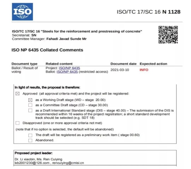 3月10日,由冶金工業信息標準研究院牽頭組織提出的首個鋼筋領域國際標準提案《鋼筋混凝土用不鏽鋼鋼筋》(Stainless steel bars for the reinforcement of concrete)被國際標準化組織(ISO)正式批準立項(ISO/NP 6435)。