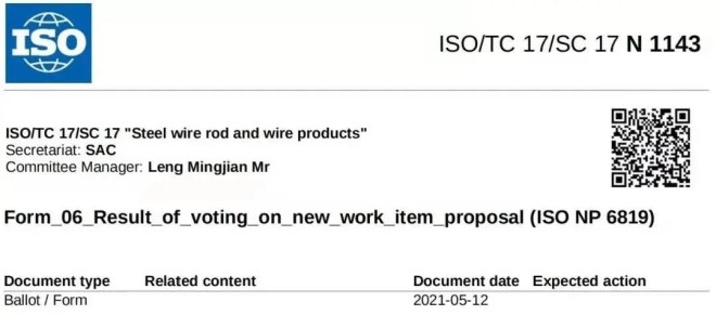 5月12日,由沙鋼、江陰興澄特鋼與冶金工業信息標準研究院等單位共同研究製定的《橋梁纜索鋼絲用盤條》國際標準,也是由中國牽頭的首個盤條領域專用國際標準,被國際標準化組織(ISO)正式批準立項(ISO/NP 6819)。標準以我國《橋梁纜索鋼絲用盤條》行業標準(YB/T 4264-2020)為基礎製定,填補了國際標準空白,也標誌著我國參與盤條領域國際標準化工作取得新的重大突破。