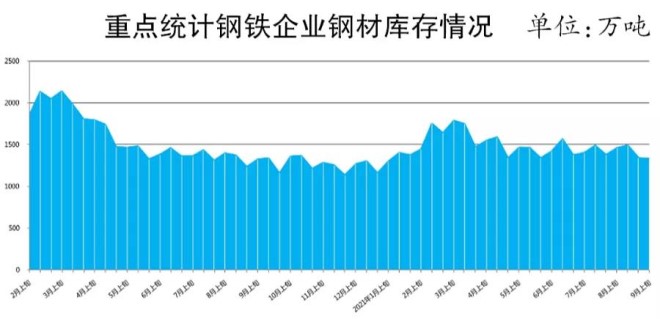 9月上旬,重點統計鋼鐵企業鋼材庫存量為1332.38萬噸,比上一旬減少10.33萬噸,降低0.77%;比8月底減少10.33萬噸,降低0.77%;比年初增加170.28萬噸,增長14.65%;同比增加5.38萬噸,增長0.41%。