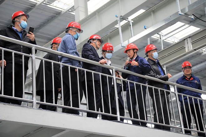 圖為技術調研組領導專家在晉南鋼鐵恒瑞昆鍍銅焊絲車間參觀