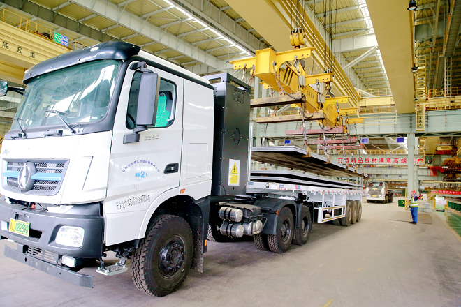 圖為電動重卡在運輸鋼板