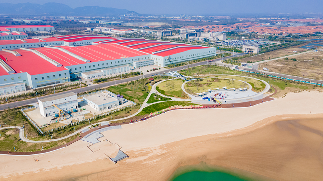 “通過設計優化,將成品碼頭與陸地之間原用於填海造地的30多公頃海域保留了下來,同時保留了珍貴的自然岸線,以此為基礎建設了沙灘公園,真正體現了節約資源、保護資源的責任擔當,踐行了人與自然和諧共生的綠色發展方式,展現出了自然生態文明與現代工業文明交相呼應的美好畫麵。”站在黃海之濱的海邊金沙灘,聶延忠介紹,如果環保做不好,藍天碧海金沙灘就會消失不見,沙灘公園就會變成垃圾場。