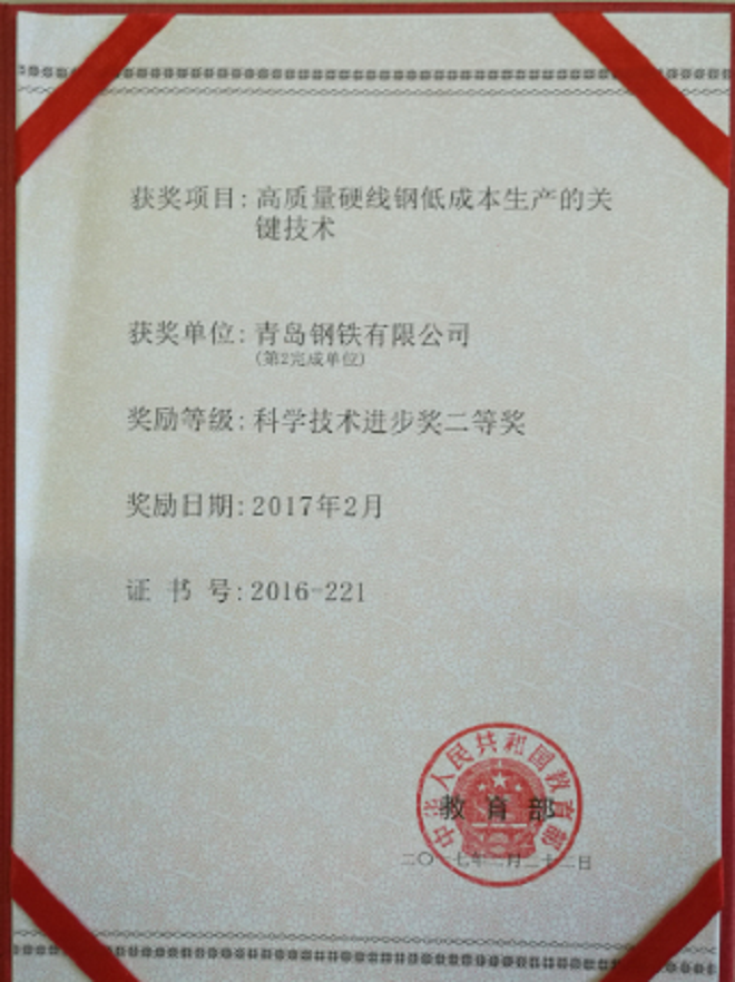 經過多年的深耕,青島特鋼在簾線鋼領域收獲了多項榮譽。其中,“高質量硬線鋼低成本生產的關鍵技術”獲得2017年國家科技進步獎二等獎,“低成本生產高質量鋼絞線和簾線用鋼的關鍵技術和產業化”獲得2016年冶金科學技術獎二等獎,青島特鋼鋼簾線用熱軋盤條獲得2018年冶金產品實物質量“金杯獎”,等等。