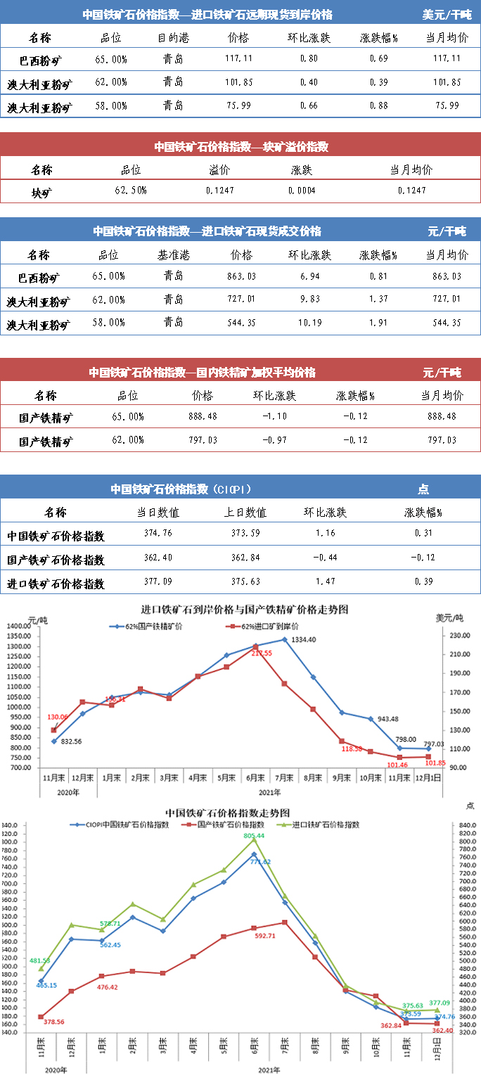 【行業指數】12月1日中國鐵礦石價格指數