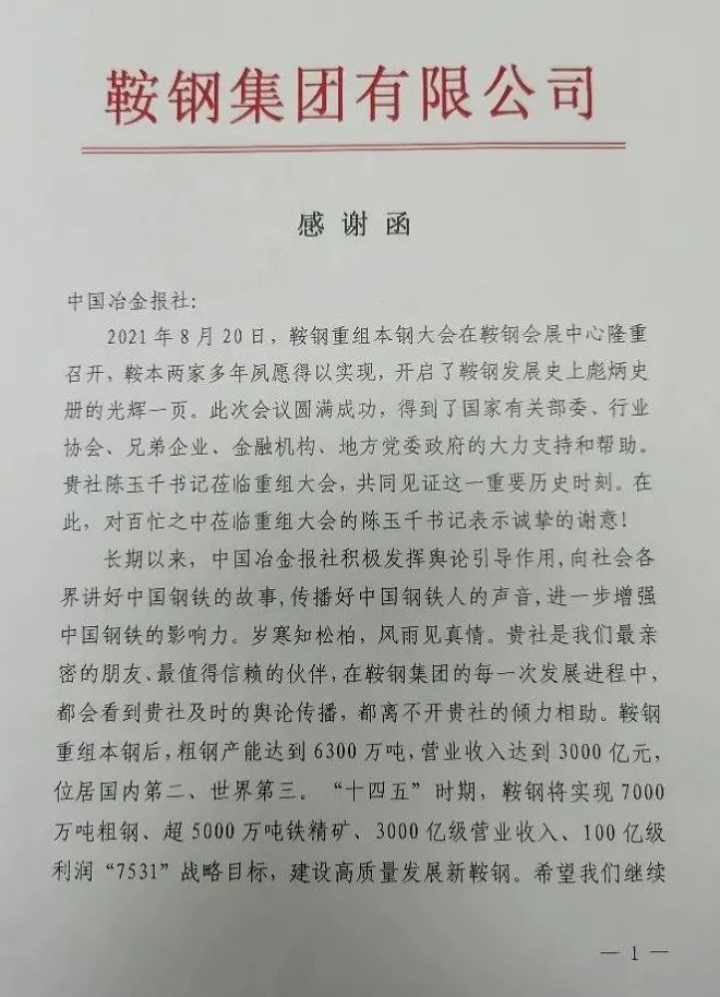 近日,鞍鋼集團有限公司致信中國冶金報社,感謝報社對鞍鋼重組本鋼的係列報道和後續服務。2021年8月20日,鞍鋼重組本鋼大會隆重召開,鞍本重組夙願達成。鞍鋼重組本鋼,是大勢所趨,更是曆史必然,又一艘世界級“鋼鐵航母”啟航,對於鋼鐵行業揚帆“十四五”,開新局、謀新篇,具有重大意義和深遠影響。