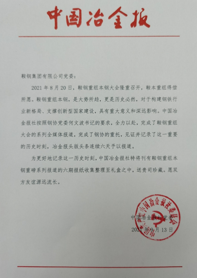 鞍鋼集團致信感謝中國冶金報社