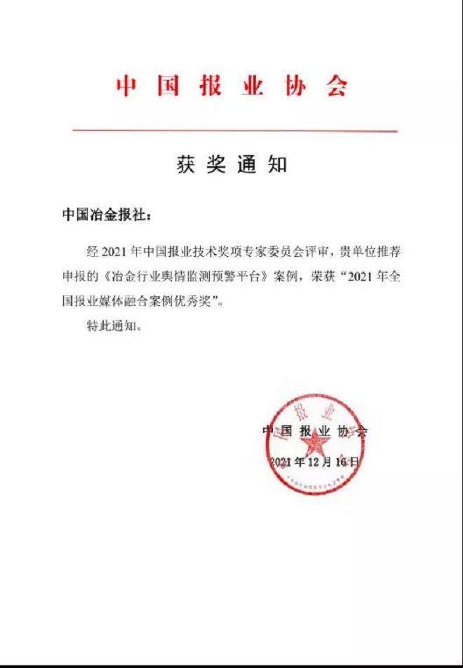 經2021年中國報業技術獎項專家委員會評審,《冶金行業輿情監測預警平台》案例榮獲“2021年全國報業媒體融合案例優秀獎”。