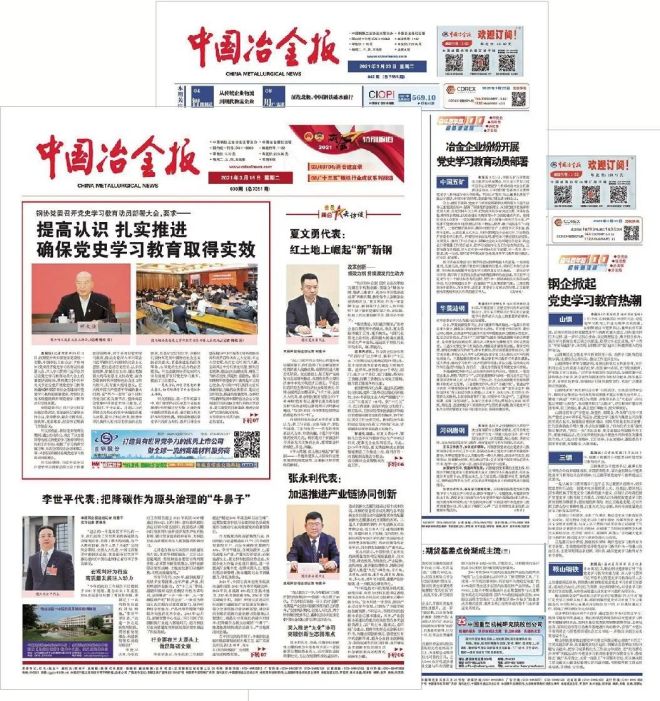 《中國冶金報》全麵聚焦鋼鐵企業黨史學習教育,尤其是邀請了鋼鐵企業各級黨委書記暢談學黨史的心得體會,分享他們學黨史與謀發展相結合、傳承紅色鋼鐵基因、推動鋼鐵企業“十四五”高質量發展的真知灼見。與此同時,《中國冶金報》還選取了行業內在深入開展黨史學習教育方麵有可借鑒經驗的優秀企業,並刊發係列報道。