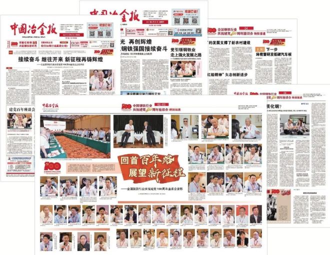 今年6月21日,由中國鋼鐵工業協會主辦,沙鋼集團、中國寶武、鞍鋼集團、首鋼集團、河鋼集團、中信泰富特鋼集團協辦,中國冶金報社承辦的全國鋼鐵行業慶祝建黨100周年座談會在北京隆重召開。《中國冶金報》以6個整版、1個通版的篇幅對本次座談會進行了全方位、多角度、深層次的係統報道,不僅全文刊發了中國鋼鐵工業協會黨委書記、執行會長何文波在本次座談會上的講話——《接續奮鬥 繼往開來 新征程再鑄輝煌》,以及中國鋼鐵工業協會時任輪值會長沈彬在本次座談會上的致辭——《致敬榮光 再創輝煌 為建設現代化鋼鐵強國接續奮鬥》,還以側記形式將出席本次座談會的老中青三代鋼鐵人對過去的回憶和未來的展望凝結在《齊聚憶黨情 共話鋼鐵新時代》一文中,分別從“憶往昔:中國鋼鐵成就源於黨的英明偉大領導”“展未來:有信心、有決心、有實力做強中國鋼鐵”兩個角度表達了三代鋼鐵人對中國鋼鐵行業未來的期盼。在此次報道中,《中國冶金報》以通版形式推出了本次座談會剪影專題報道,展現了老中青三代鋼鐵人的風采。