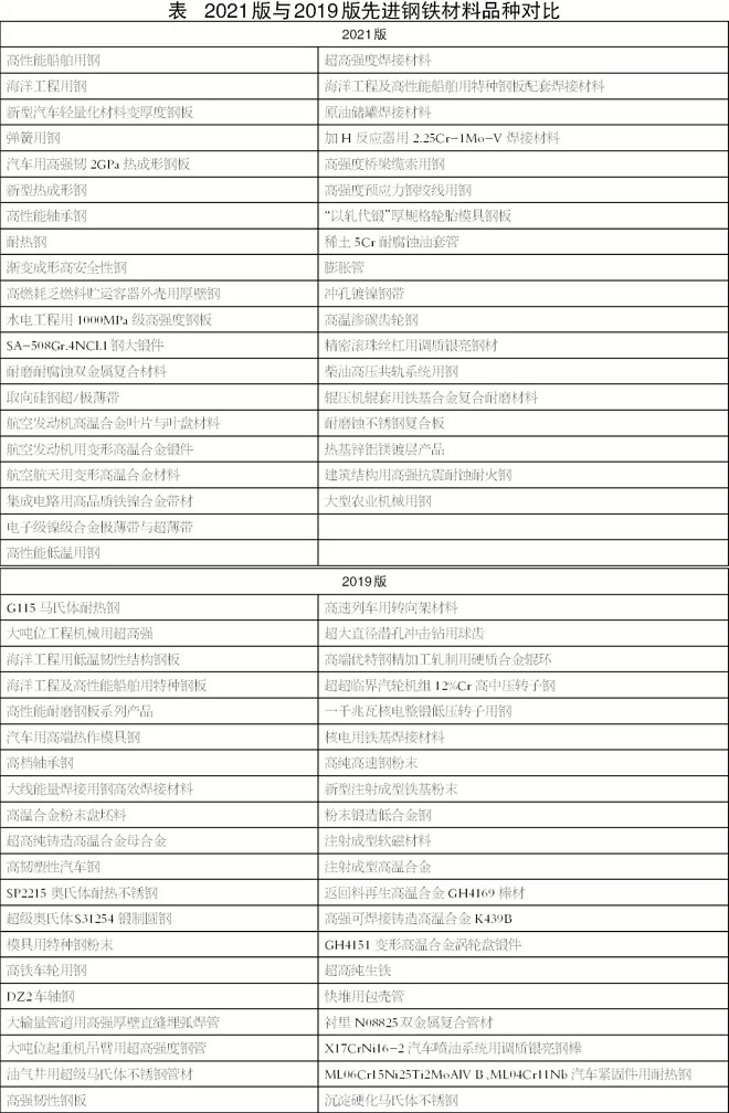 《指導目錄(2021版)》已於2022年1月1日起施行,原《重點新材料首批次應用示範指導目錄(2019版)》 (工信部原[2019]254號)同時廢止。較上一版,《指導目錄(2021版)》先進鋼鐵材料變化較大(詳見表 2021版與2019版先進鋼鐵材料品種對比),其中尤為明顯的是新增了電子信息用鋼。