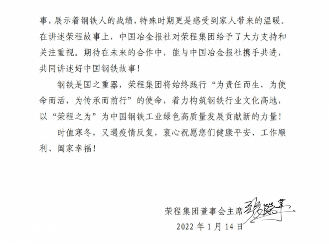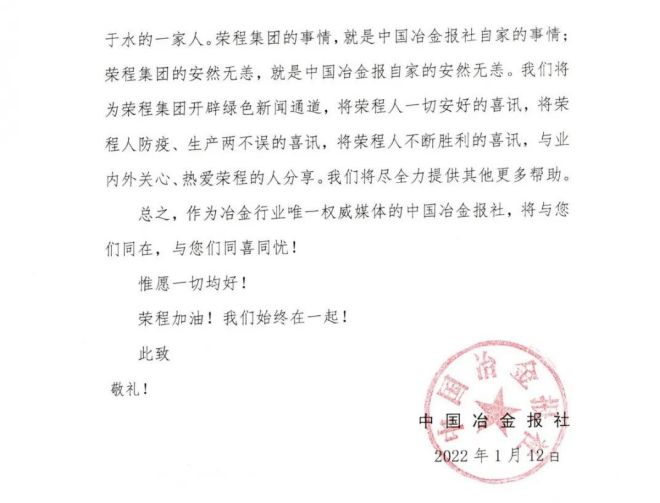 1月14日,榮程集團向中國冶金報社發來感謝信,表示在疫情防控的特殊時期,報社的慰問與支持,讓榮程集團上下深受鼓舞,倍感振奮。