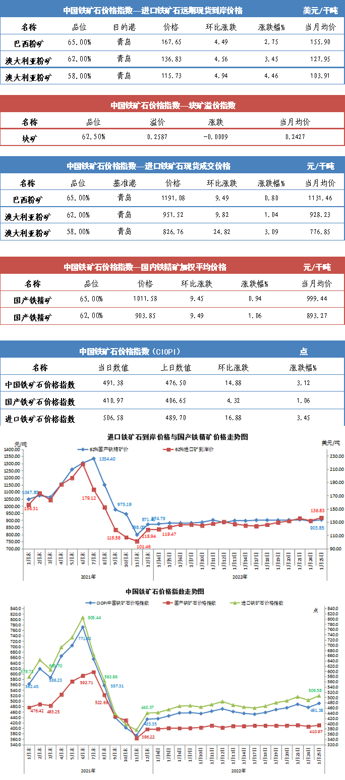 【行業指數】1月25日中國鐵礦石價格指數