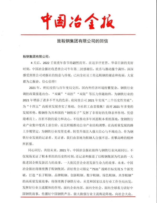 鞍鋼集團致中國冶金報社的感謝信