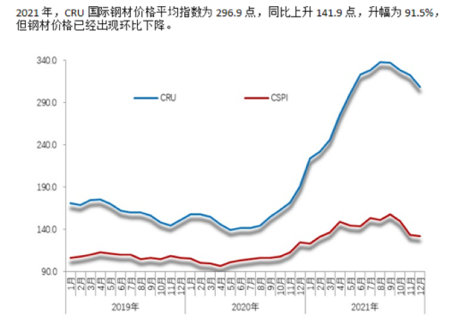 值得注意的是,從2021年鋼鐵行業整體運行情況來看,行業發展要重點關注三個問題:一是如何以充分的產能適應需求變化的彈性。2021年上半年,供需基本動態均衡主要得益於鋼材市場旺盛的需求;下半年市場需求收縮,實現供需基本動態均衡主要得益於政府部門采取的產能產量“雙控”措施。未來,市場需求變化的不確定性依然存在,保持供需基本動態均衡關係到行業平穩運行,而解決這個問題的關鍵是堅持法製化、市場化原則,既希望保持政策的連續性、穩wen定ding性xing和he政zheng策ce措cuo施shi的de進jin一yi步bu優you化hua,更geng需xu要yao加jia強qiang行xing業ye加jia強qiang自zi律lv,共gong同tong維wei護hu市shi場chang秩zhi序xu,推tui動dong鋼gang鐵tie行xing業ye高gao質zhi量liang發fa展zhan。二er是shi行xing業ye效xiao益yi月yue度du波bo動dong較jiao大da。2021年,鋼材市場階段性需求的快速變化、原燃料價格超常規上漲並高位波動、鋼材價格創紀錄的衝高及後期的明顯回落,以及產能利用率波動帶來的工序間能源平衡失配、固gu定ding費fei用yong攤tan薄bo等deng多duo重zhong因yin素su疊die加jia導dao致zhi的de企qi業ye運yun行xing成cheng本ben升sheng高gao,給gei鋼gang鐵tie行xing業ye的de穩wen定ding運yun行xing造zao成cheng了le巨ju大da衝chong擊ji,致zhi使shi行xing業ye效xiao益yi月yue度du波bo動dong較jiao大da。三san是shi國guo際ji鋼gang產chan量liang增zeng長chang明ming顯xian,國guo際ji鋼gang材cai市shi場chang價jia格ge已yi開kai始shi下xia行xing。2021年前11個月,除中國外,國際鐵、鋼產量同比增幅均超過10%。2021 年,CRU 國際鋼材價格平均指數為 296.9 點,同比上升 141.9 點,升幅為 91.5%,但鋼材價格已經出現環比下降。
