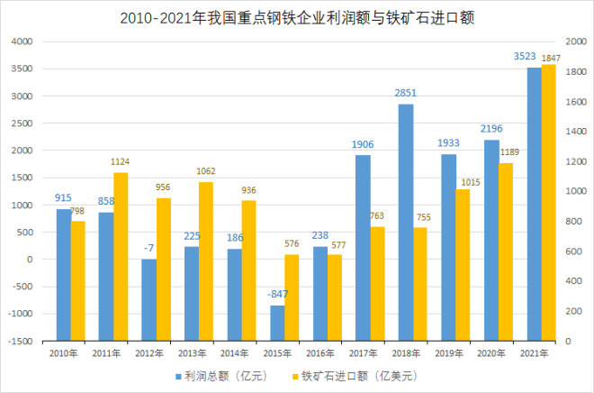 在鋼鐵產業鏈上,長期以來,鋼鐵行業合理利潤極大程度被上遊尤其是海外鐵礦資源企業超額分割。盡管2021年鐵礦石進口額創下新高,但根據測算,2021年實施的產能產量“雙控”政策使我國鋼鐵企業節省采購費用超過2400億元,相當於少花了2400億元的“冤枉錢”。