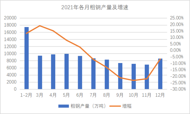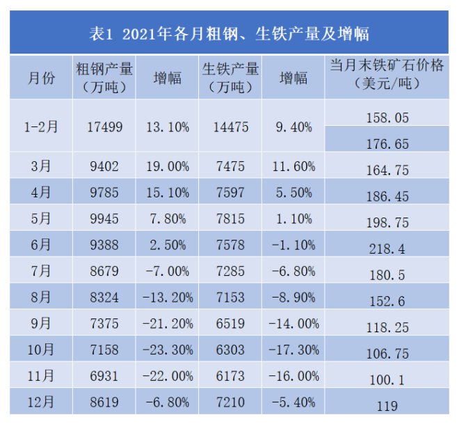 直到2021年7月份,在國家發展改革委、工業和信息化部、生態環境部等多部委的組織協調下,各地方的產能產量“雙控”工作進入實質性推進階段,與上半年幾近2位數的產量增幅相比,下半年鋼鐵生產完全是“火冰兩重天”。7月份開始,各月粗鋼產量均同比下跌,進口鐵礦石價格開始下行。從2021年下半年各月數據來看,7月份同比壓減粗鋼657萬噸,8月份同比壓減1161萬噸,9月份同比壓減1881萬噸,10月份同比壓減2062萬噸,11月份同比壓減1835萬噸,12月份同比壓減506萬噸。2021年下半年,我國累計壓減粗鋼產量8100萬噸以上,相當於世界第三大產鋼國日本2020年全年的粗鋼產量。