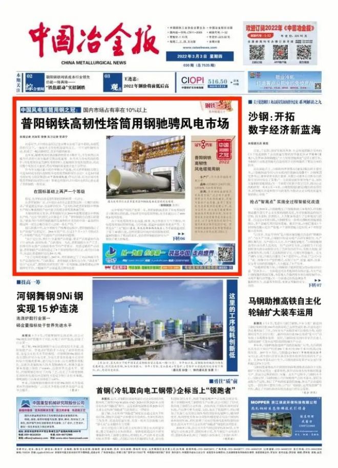 【中國風電塔筒用鋼之冠】國內市場占有率在10%以上,普陽鋼鐵高韌性塔筒用鋼馳騁風電市場