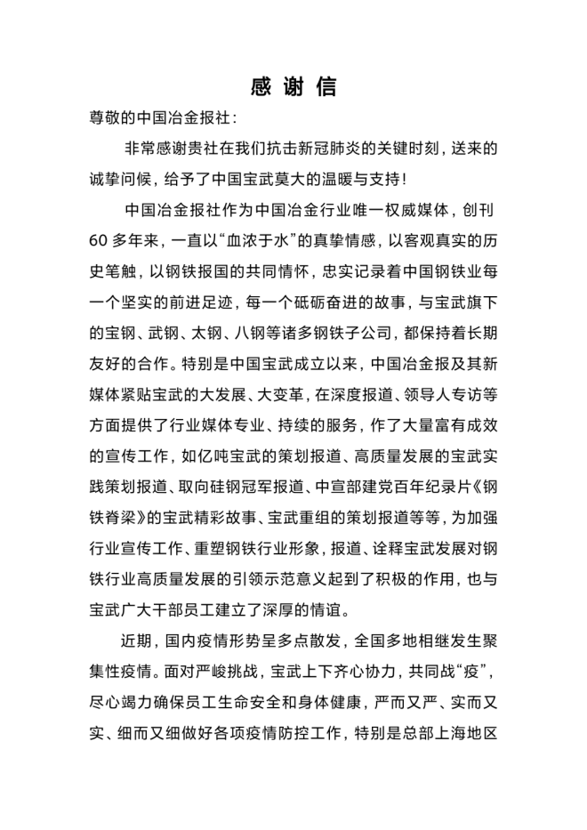 中國寶武致中國冶金報社的感謝信 ·