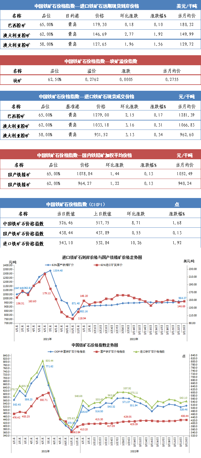 【行業指數】3月23日中國鐵礦石價格指數