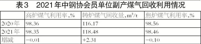 2021年鋼協會員企業轉爐煤氣回收利用水平提高,有利於企業綜合節能。高爐和焦爐煤氣利用率下降,不利於節能(見表3)。
