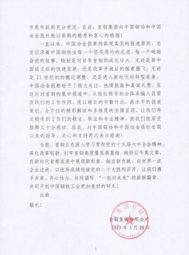 3月28日,首鋼集團向中國冶金報社發來感謝信,對報社圍繞首鋼轉型發展和服務保障冬奧等工作進行的一係列專題報道表示感謝。