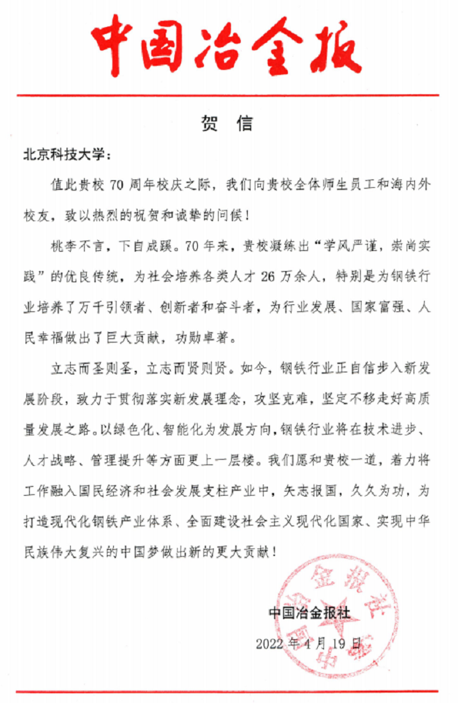 立(li)誌(zhi)而(er)聖(sheng)則(ze)聖(sheng),立(li)誌(zhi)而(er)賢(xian)則(ze)賢(xian)。如(ru)今(jin),鋼(gang)鐵(tie)行(xing)業(ye)正(zheng)自(zi)信(xin)步(bu)入(ru)新(xin)發(fa)展(zhan)階(jie)段(duan),致(zhi)力(li)於(yu)貫(guan)徹(che)落(luo)實(shi)新(xin)發(fa)展(zhan)理(li)念(nian),攻(gong)堅(jian)克(ke)難(nan),堅(jian)定(ding)不(bu)移(yi)走(zou)好(hao)高(gao)質(zhi)量(liang)發(fa)展(zhan)之(zhi)路(lu)。以(yi)綠(lv)色(se)化(hua)、智能化為發展方向,鋼鐵行業將在技術進步、人才戰略、管(guan)理(li)提(ti)升(sheng)等(deng)方(fang)麵(mian)更(geng)上(shang)一(yi)層(ceng)樓(lou)。我(wo)們(men)願(yuan)和(he)貴(gui)校(xiao)一(yi)道(dao),著(zhe)力(li)將(jiang)工(gong)作(zuo)融(rong)入(ru)國(guo)民(min)經(jing)濟(ji)和(he)社(she)會(hui)發(fa)展(zhan)支(zhi)柱(zhu)產(chan)業(ye)中(zhong),矢(shi)誌(zhi)報(bao)國(guo),久(jiu)久(jiu)為(wei)功(gong),為(wei)打(da)造(zao)現(xian)代(dai)化(hua)鋼(gang)鐵(tie)產(chan)業(ye)體(ti)係(xi)、全麵建設社會主義現代化國家、實現中華民族偉大複興的中國夢做出新的更大貢獻!