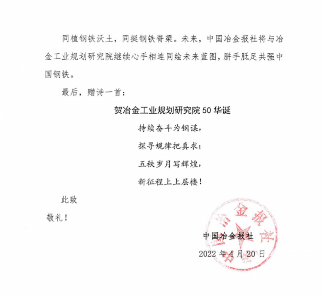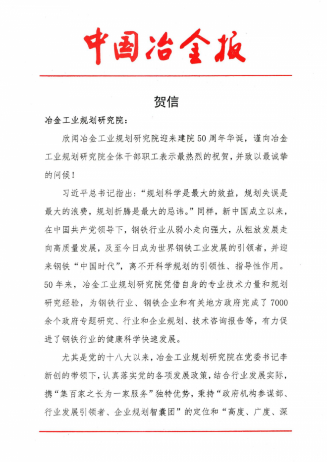 信中提到,欣聞冶金工業規劃研究院迎來建院50周年華誕,謹向冶金工業規劃研究院全體幹部職工表示最熱烈的祝賀,並致以最誠摯的問候!