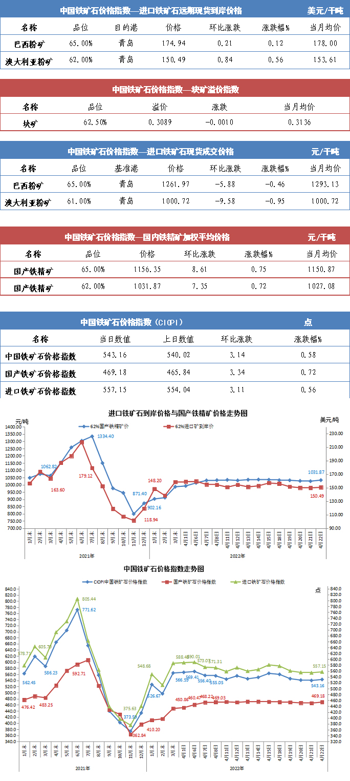 【行業指數】4月22日中國鐵礦石價格指數
