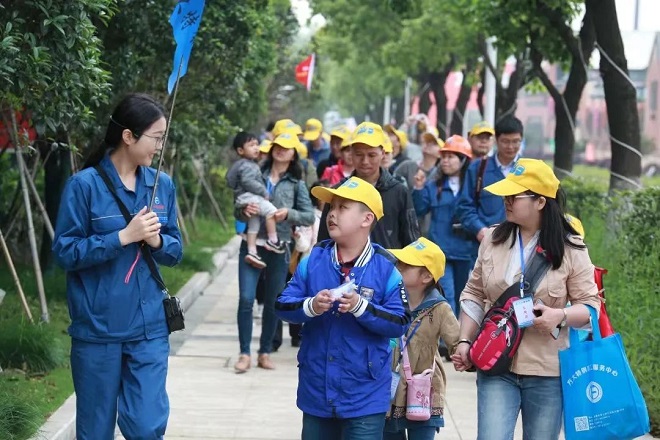 圖為羅誌玲(左一)帶領南昌市民參觀方大特鋼,講解“鋼鐵是怎樣煉成的”。(段文海 攝)