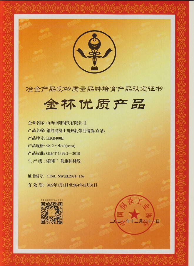 前段時間,中國鋼鐵工業協會發布了2021年冶金產品實物質量品牌培育產品名單。中陽鋼鐵生產的鋼筋混凝土用熱軋帶肋鋼筋(直條)榜上有名,榮獲“金杯優質產品”榮譽,進一步擦亮了“中玉”品牌。這是中陽鋼鐵首次申報該殊榮。而能夠一舉獲得中國鋼鐵行業產品的“奧斯卡”獎,也充分證明了中陽鋼鐵產品質量的可靠性。
