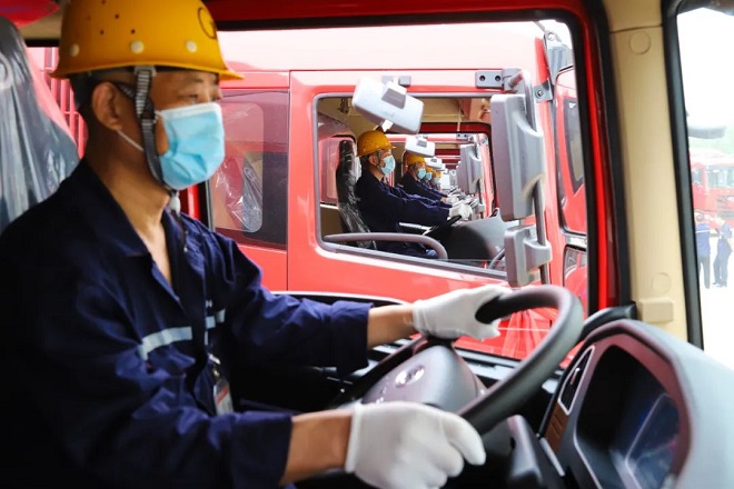 新天鋼也是天津市首家購入純電重卡並投入運行的企業,相比傳統燃油車型,每輛車每年減少燃油消耗約4萬升,現有200輛純電重卡每年碳減排約105噸。近日,新天鋼集團與中石化、三一重卡、國氫新能源公司合作建設的天津首批全鏈條聯建加氫站項目投入運營,清潔運輸體係建設再邁出堅實一步。2座加氫站設計日加氫能力1000公斤,可滿足60輛氫能重卡加注需求,日減少柴油消耗6000升,年減少二氧化碳排放5600噸,且均預留了設備提升空間。