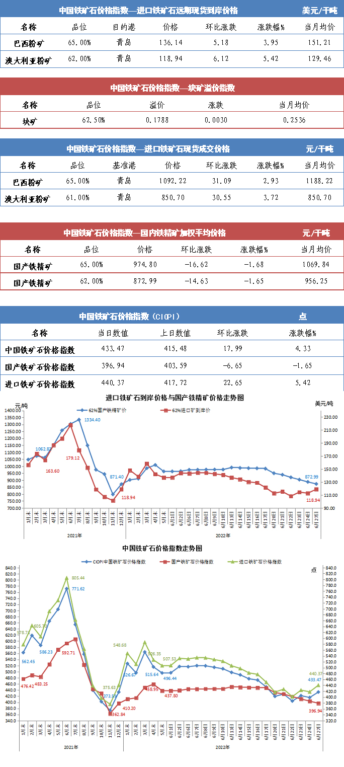 【行業指數】6月27日中國鐵礦石價格指數