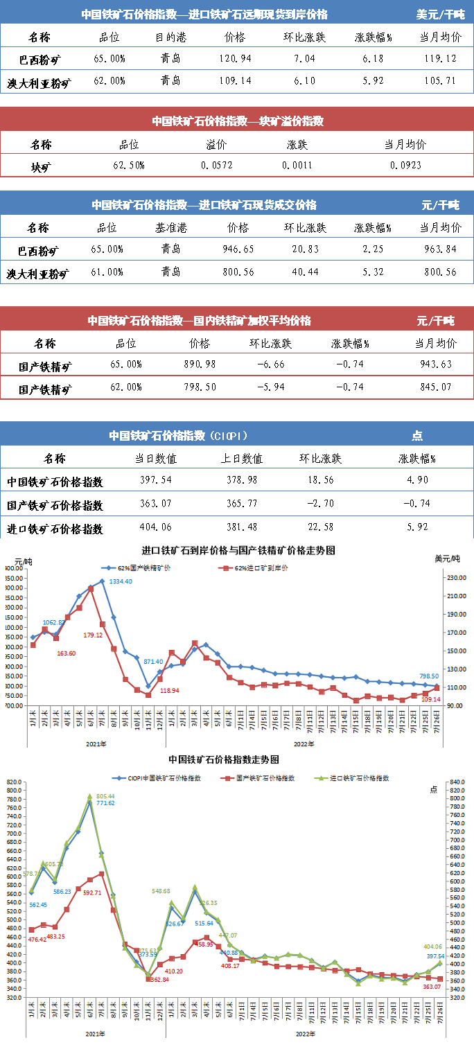 【行業指數】7月26日中國鐵礦石價格指數