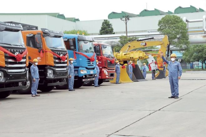 圖為中冶寶鋼191台套涉及32種規格型號的工程機械和運輸車輛在寶鋼股份寶山基地有序投入使用。