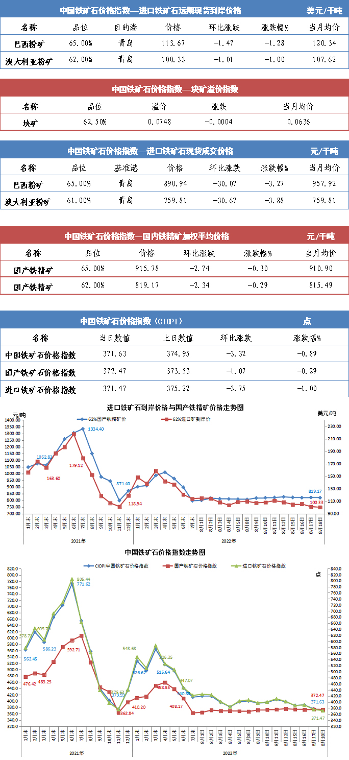 【行業指數】8月18日中國鐵礦石價格指數