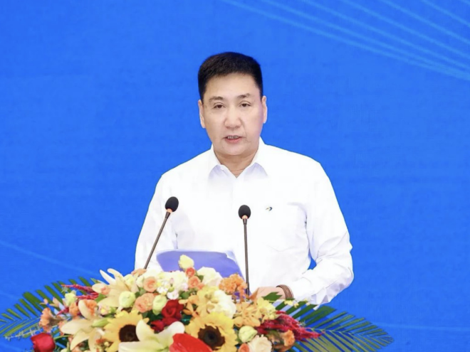 圖為中國房地產業協會智能建造委員會執行主任兼秘書長、北京建誼投資發展(集團)有限公司董事長張鳴作主題報告。